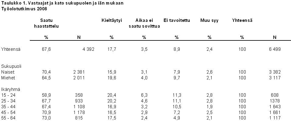 Tutkimustulosten oikeellisuuteen vaikuttaa myös vastauskato. Yleistä kehitystä heijastaen myös työolotutkimusten vastauskato on kasvanut tutkimus tutkimukselta. Vuonna 2008 vastausprosentti oli 68. Kadon tarkempi jakauma sukupuolen ja 10-vuotisikäluokan mukaan käy ilmi alla olevasta taulukosta 1.