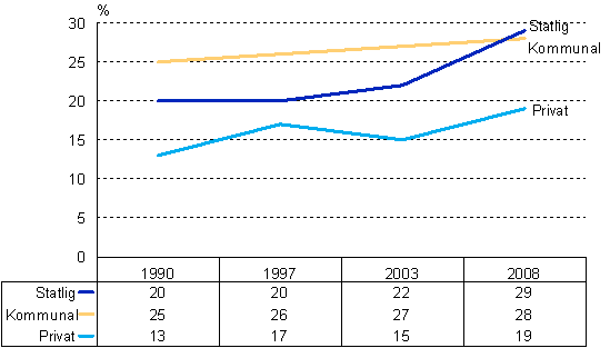 Källa: Työolojen kolme vuosikymmentä. Työolotutkimusten tuloksia 1977-2008. Tilastokeskus (ung. Arbetsmiljön under tre decennier. Resultat av arbetsmiljöundersökningarna 1977-2008. Statistikcentralen)