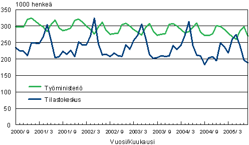 Työttömät Tilastokeskuksen työvoimatutkimuksen ja työministeriön työnvälitystilaston mukaan