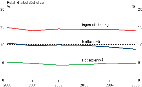 De relativa arbetslöshetstalen efter utbildningsnivå åren 2000-2005