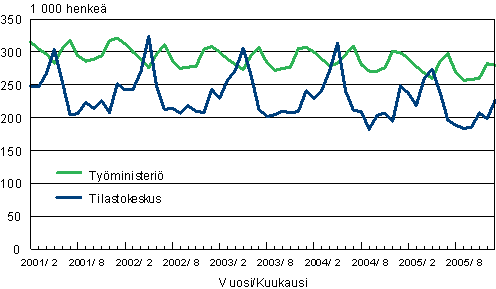Työttömät Tilastokeskuksen työvoimatutkimuksen ja työministeriön työnvälitystilaston mukaan