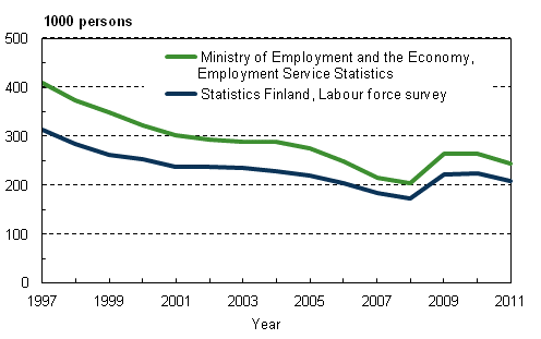 Unemployed persons in the statistics of Statistics Finland and the Ministry of Employment and the Economy in 1997–2011