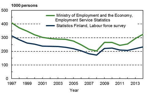 Statistics Finland's unemployment figures are based on the sample-based Labour Force Survey. The figures of the Ministry of Employment and the Economy are in turn based on the Employment Ser-vice Statistics made on the basis of the Employment and Economic Development Offices' customer registers. The figures of Statistics Finland's Labour Force Survey and of the Ministry of Employment and the Economy have always deviated from each other. Between 2006 and 2011, the Labour Force Survey indicates that the number of unemployed has been on the annual level 31,000 to 44,000 lower than according to the Employment Service Statistics. Starting from 2012, the difference in the num-ber of unemployed persons has grown, being 94,000 in 2014 (Figure). The main reason for the differ-ence in unemployment figures is the differing definition of unemployed in the two statistics. In addi-tion, the difference has grown due to the discontinuation of unemployment pension and legislative amendments have an effect on the definition of unemployed job seekers in the Employment Service Statistics.