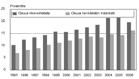 Ulkomaisten tytäryhtiöiden liikevaihdon ja henkilöstön määrän osuus kaikista yrityksistä 1996-2006