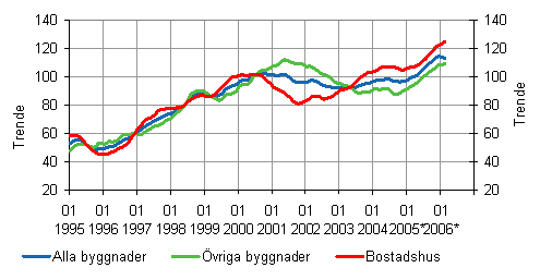 Volymindexet för nybyggnad steg med 16 procent i februari 2006. Bostadsbyggnadsvolymen som började öka i juni 2005 var fortsättningsvis hög. Av bostadsbyggnaderna steg egnahemshusvolymen med över 21 procent, radhusvolymen med närmare 30 procent och höghusvolymen med 13 procent jämfört med februari 2005.