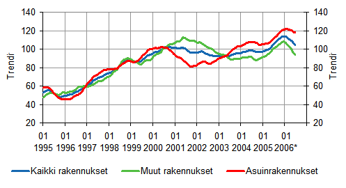 Uudisrakentamisen volyymi-indeksi kääntyi Tilastokeskuksen ennakkotietojen mukaan 2006 kesäkuussa vajaan prosentin laskuun edellisen vuoden kesäkuuhun verrattuna.