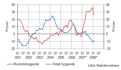 Volymen av annat byggande än bostadsbyggande ökade med 27 procent jämfört med februari året innan. Tillväxttakten i början av året har avtagit något jämfört med slutet av året. En avmattning har skett i alla byggnadstyper med en kraftig tillväxt.