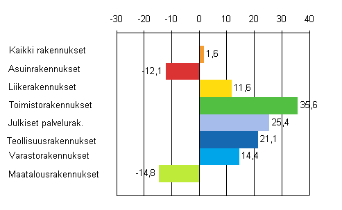 Liikerakentamisen volyymin viime vuotinen huima kasvu on kääntynyt laskuksi. Volyymi supistui lokakuussa 15,9 prosenttia. Toimistorakentamisen volyymi on vielä lievässä kasvussa, lokakuussa 7,8 prosenttia. Teollisuusrakentamisen volyymi kasvoi lokakuussa 3,3 prosenttia. Vuoden alkukuukausina hyvänä jatkuneen kasvun ansiosta ovat kuitenkin kaikkien ryhmien volyymit, paitsi asuin- ja maatalousrakentamisen, huomattavasti suuremmat kuin edellisvuonna.