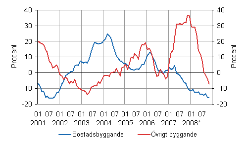 Volymökningen inom affärsbyggande bröts i början av hösten och volymen började minska. Volymen för november var 23 procent mindre än i november år 2007. Volymen av affärsbyggande visar fortfarande en svag ökning som håller på att mattas av. I november var ökningen bara drygt 2 procent jämfört med föregående år. Ökningen av volymen inom industribyggande vände nedåt i november och volymen minskade med 2 procent från året innan.