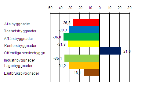 Avvikande från de andra grupperna ökade volymen inom offentliga servicebyggnader med närmare 22 procent jämfört med året innan.