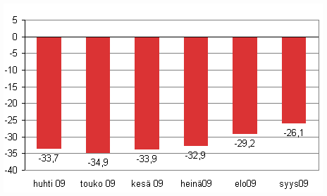 Uudisrakentamisen volyymi supistui Tilastokeskuksen ennakkotietojen mukaan tämän vuoden heinä-syyskuussa 29 prosenttia edellisen vuoden vastaavaan aikaan verrattuna. Vuonna 2008 talouden taantuma alkoi vaikuttaa rakentamiseen vuoden loppupuoliskolla ja volyymi supistui ensimmäisen kerran kolmannella neljänneksellä. Siitä lähtien lasku on jatkunut nopeutuvalla vauhdilla.
