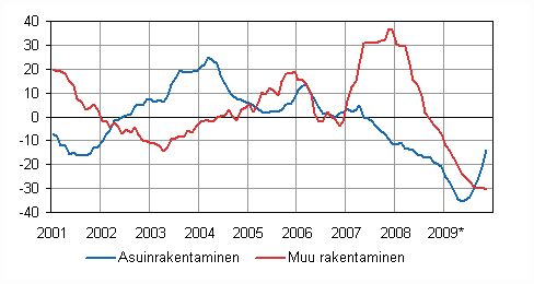 Asuinrakentamisen volyymi oli marraskuussa vielä 13,8 prosenttia vuodentakaista pienempi, mutta varsinkin kerrostalorakentamisen volyymin lasku on hidastunut voimakkaasti. Muun kuin asuinrakentamisen supistuminen sen sijaan on nopeutunut entisestään. Laskua edellisvuoden marraskuuhun verraten oli 30,3 prosenttia. Teollisuusrakentamisen volyymi oli vain vajaa puolet edellisvuotisesta ja suurin oli toimistorakentamisen volyymin lasku, 64,2 prosenttia.
