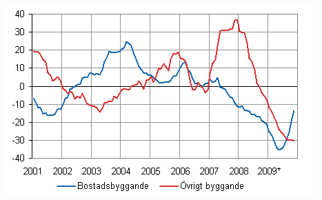 Volymen av bostadsbyggande var så sent som i november 13,8 procent mindre än året innan, men i synnerhet volymminskningen inom byggande av flervåningshus har kraftigt avtagit. Däremot har övrigt byggande minskat i en snabbare takt än tidigare. Minskningen jämfört med november året innan var 30,3 procent. Volymen av industribyggande var bara något under hälften jämfört med året innan och den största volymminskningen visade kontorsbyggande, 64,2 procent.