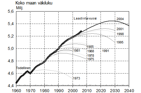 Kuviossa 1 on esitetty Tilastokeskuksen kunnittaisten väestöennusteiden koko maan väkiluvut vuoden 1973 ennusteesta lähtien. Muutamaa poikkeusta lukuun ottamatta uuden ennusteen väkiluku on kulkenut edellisen ennusteen yläpuolella, kun todellinen väestönkehitys on ylittänyt ennusteen. Merkittävin syy aikaisempien ennusteiden jäämiseen alle todellisen kehityksen on ollut siinä, että maahanmuuttovoittoa on oletettu saatavan vain muutamana alkuvuonna, minkä jälkeen nettomaahanmuutto on oletettu nollaksi. Lisäksi aikaisemmissa ennusteissa kuolevuuden alenemisen on oletettu pysähtyvän muutaman vuosikymmenen jälkeen.