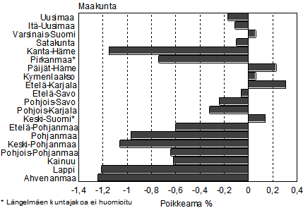 Kuviossa 2 on maakuntien ennusteväkilukujen suhteelliset poikkeamat todellisista luvuista kolmannen ennustevuoden lopussa. Vuosien 2004-2006 aikana maakuntien välinen muutto on ollut tasapainoisempaa kuin 2000-luvun alussa. Perinteisten muuttotappiomaakuntien muuttotappiot pienenivät oleellisesti ja näin ollen näiden maakuntien kohdalla todellinen väkiluku on ennustettua suurempi.
