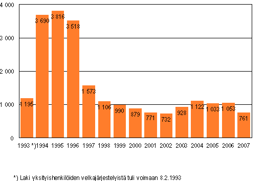 Tammi-maaliskuussa 2007 jätettiin käräjäoikeuksiin 761 yksityishenkilöiden velkajärjestelyhakemusta, mikä on 292 vähemmän kuin vastaavana ajankohtana vuotta aiemmin.