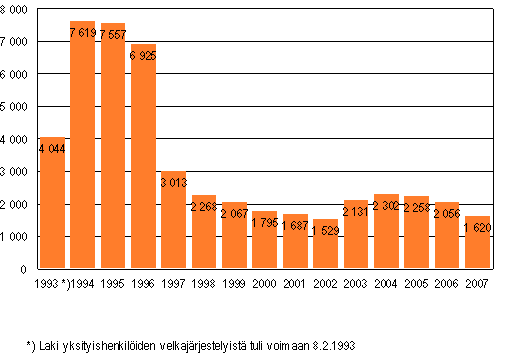 Tammi-kesäkuussa 2007 jätettiin käräjäoikeuksiin 1 620 yksityishenkilöiden velkajärjestelyhakemusta, mikä on 436 vähemmän kuin vastaavana ajankohtana vuotta aiemmin.