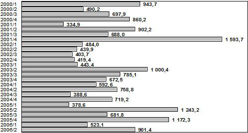 Nya statsgarantier kvartalsvis under åren 2000-20006, mn euro