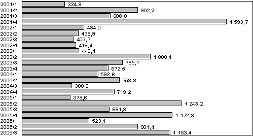 Valtion myöntämät uudet takaukset neljännesvuosittain vuosina 2001 - 2006, milj. euroa