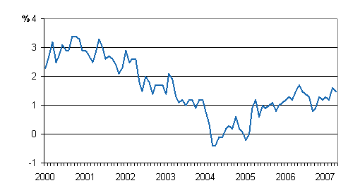 Förändringen av det harmoniserade konsumentprisindexet på årsnivå i Finland 1/2000 - 4/2007