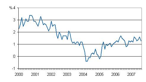 Förändringen av det harmoniserade konsumentprisindexet på årsnivå i Finland 1/2000 - 8/2007