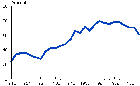 Bild 1. Valdeltagande i kommunalvalen 1918-1996, (%)