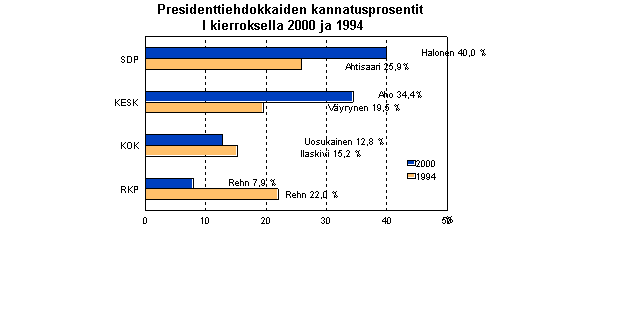 Esko Ahon ja Tarja Halosen kannatus vaalin ensimmäisellä kierroksella oli huomattavasti suurempi kuin heidän edustamiensa puolueiden kannatus viime eduskuntavaaleissa. Ahon kannatus oli 12,0 prosenttiyksikköä suurempi kuin Keskustan kannatus edellisissä eduskuntavaaleissa ja Halosen kannatus 17,2 prosenttiyksikköä suurempi kuin puolueen kannatus eduskuntavaaleissa 1999.