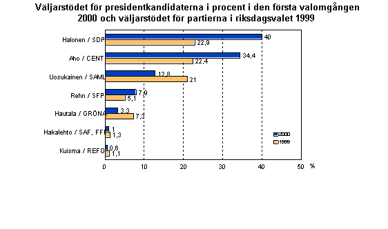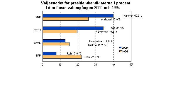 Väljarstödet för Esko Aho och Tarja Halonen under den första valomgången var betydligt större än väljarstödet för de partier de representerar i det förra riksdagsvalet. Väljarstödet för Aho var 12,0 procentenheter större än väljarstödet för Centern i det förra riksdagsvalet och väljarstödet för Halonen var 17,2 procentenheter större än väljarstödet för SDP i det förra riksdagsvalet.