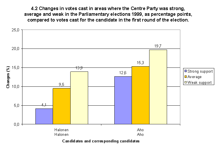 Changes in votes cast in areas where the Centre Party was strong, average and weak