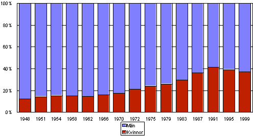 Andelen kvinnor och män av kandidaterna i riksdagsvalen 1948 - 1999, %