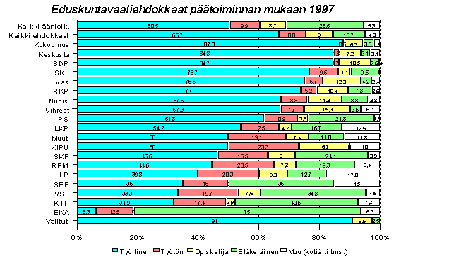 Puolueittain ehdokkailla on selviä eroja. Kaikista äänioikeutetuista työllisiä on puolet, työttömiä ja opiskelijoita kymmenen prosenttia ja eläkeläisiä neljännes. Kolmella suurimmalla puolueella: Kokoomuksella, Keskustalla ja SDP:llä lähes kaikki ehdokkaat ovat työllisiä (85-88 prosenttia), työttömiä ei ole ehdokkaina juuri lainkaan ja opiskelijoita ja eläkeläisiä yhteensä kymmenkunta prosenttia. Kristillisellä liitolla, Vasemmistoliitolla, RKP:llä, Nuorsuomalaisilla ja Vihreillä on työllisiä suurpuolueita vähemmän, mutta työttömiä ja opiskelijoita enemmän ehdokkaina. Pienimmissä puolueissa ei-työllisten määrät kasvavat jopa väestön keskitasoa korkeammiksi. Kirjava "Puolue" muistuttaa ehdokasrakenteeltaan eniten väestön keskitasoa. KIPU:uun, Remonttiryhmään ja LLP:hen on asettunut ehdokkaiksi eniten työttömiä ja eläkeläispuolueilla on suhteellisesti eniten eläkeläisehdokkaita. KIPU:lla, Vihreillä ja Vasemmistoliitolla on opiskelijaehdokkaita keskitasoa enemmän.