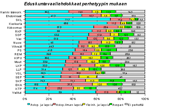 Kaikista äänioikeutetuista reilu puolet (56 %) on vihittyjen avioperheiden jäseniä, 12 prosenttia avoliitoissa eläviä ja perheisiin kuulumattomia on neljännes. Ehdokkaista 64 prosenttia elää avioliitossa, avoliitossa 10 ja perheiden ulkopuolella 19 prosenttia. Yksinhuoltajia on kummassakin ryhmässä 8 prosenttia. Kristillisen liiton ehdokkaat poikkeavat normaaliväestöstä eniten: 88 prosenttia on avioliitossa ja avoliitossa eläviä on vain 3 prosenttia. Myös suurten puolueiden ehdokkaista enemmistö on peräisin avioperheistä: Keskustalla 80 %, Kokoomuksella 78 % ja SDP:llä 71 %, avoliittolaisia on eniten SDP:llä eli 13 %. Suurten puolueiden ehdokkaista yli puolella on kotonaan aviopuolison lisäksi myös lapsia, joten lapsiperheiden elämä on heille tutumpaa kuin äänestäjille keskimäärin, tutuinta se on Kristillisen liiton ja Keskustan ehdokkaille. Valituista edustajista selvällä enemmistöllä (61%) on elinympäristönä traditionaalinen perhe, jossa on molemmat puolisot ja lapsia. Äänioikeutetuista tällaisissa perheissä elää vain joka kolmas.