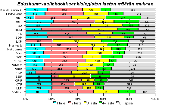 22 % ja Kokoomuksen ehdokkaista 23 %. Lastenhoitoasiat ovat siis ehdokkailla tuoreemmassa muistissa kuin väestöllä keskimäärin. Niillä puolueilla, joilla on enemmän nuoria opiskelijaehdokkaita on lapsettomien osuus suurempi.