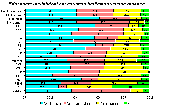 Suomessa asutaan yleensä omistusasunnoissa: äänioikeutetuista vain 22 prosenttia asuu vuokralla, samoin ehdokkaista. Suurten puolueiden perheelliset ehdokkaat asuvat omistusasunnoissaan. Keskustan, Kokoomuksen ja SDP:n ehdokkaista kahdeksan kymmenestä asuu omistusasunnossa, joka usein on omakotitalo. SDP:n ja Kokoomuksen ehdokkaista 40 prosenttia asuu osakehuoneistoissa.