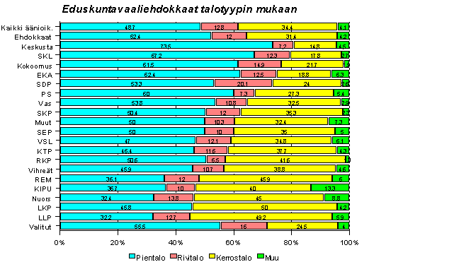 Keskustan, Kokoomuksen, Kristillisen liiton ja myöskin SDP:n sekä Vasemmistoliiton ehdokkaiden asunto sijaitsee omakotitalossa. Kerrostaloissa asuu näiden puolueiden ehdokkaista vain 15-25 prosenttia. Koko äänestäjäkunnasta kerrostaloissa asuu kolmannes eli 34 prosenttia. Asumismuodoiltaan kansaedustajat eivät paljoa poikkea äänioikeutetuista: 85 prosenttia asuu omistusasunnosta, äänioikeutetuista 71 prosenttia.
