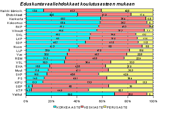 Eduskuntaan valitaan korkeasti koulutettua väkeä. Lähes kaikkien puolueiden ehdokkaiden koulutustaso on parempi kuin väestöllä keskimäärin. Koko väestöstä perusasteen koulutuksen varassa on 41 prosenttia, mutta ehdokkaista vain 17 prosenttia ja suurten puolueiden ehdokkaista vielä vähemmän eli Keskustalla 6, Kokoomuksella 5, RKP:llä 3, vihreillä 7 ja SDP:llä 12 prosenttia. Yliopistotasoinen korkean asteen koulutus on lähes 60 prosentilla suurten puolueiden ehdokkaista, äänioikeutetuista yliopistokoulutus vain 14 prosentilla. Vanhemman väestön koulutustaso on keskimääräistä alempi ja siksi myöskin eläkeläispuolueiden koulutustaso on alempi.