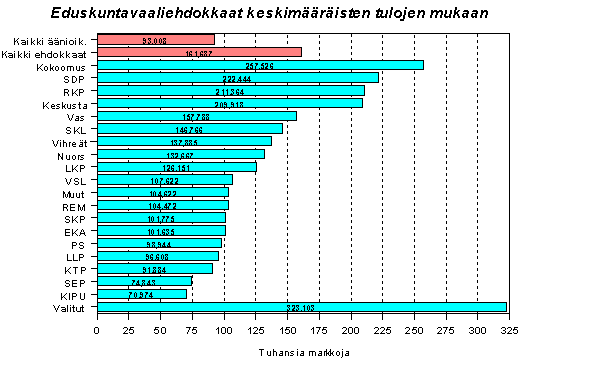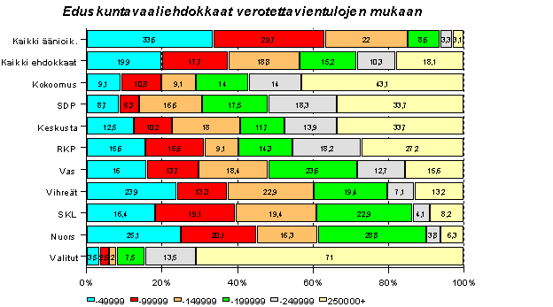 Kaikista äänioikeutetuista vain 6 prosentilla tulot ylittävät 200 000 markkaa. Keskusta ja RKP poikkeavat Kokoomuksesta ja SDP:stä siinä suhteessa, että niiden listoilla on myös alle 50 000 markkaa ansaitsevia. Samoin Vihreillä ja Nuorsuomalaisilla, jotka ovat ottaneet ehdokaslistoilleen muita puolueita runsaammin esim. opiskelijoita. Joka kolmas äänestäjä joutuu tulemaan toimeen alle 50 000 markan tuloilla, Kokoomuksen ehdokkaista joka kymmenes.