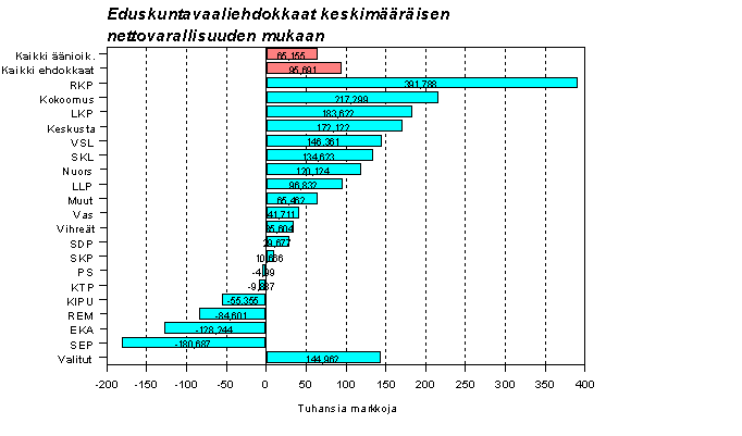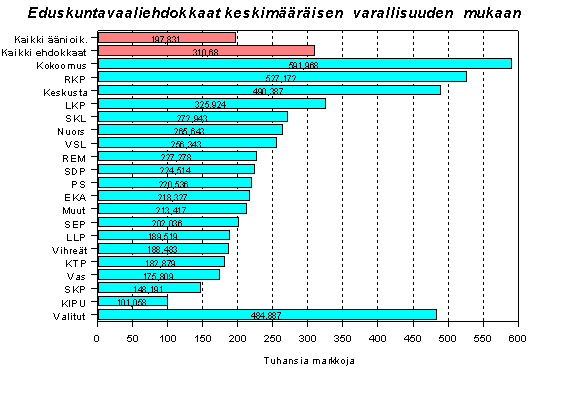 Äänioikeutetuilla on verotuksen mukaan varallisuutta keskimäärin 200 000 markan arvosta, ehdokkailla sitä on 310 000 markan arvosta. Varallisuutta on eniten Kokoomuksen ehdokkailla