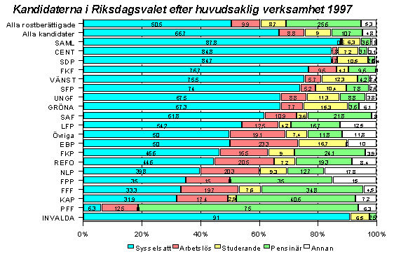 Det förekommer tydliga skillnader mellan kandidaterna beroende på parti. Av samtliga röstberättigade är hälften sysselsatta, tio procent är arbetslösa, tio procent är studerande och en fjärdedel är pensionärer. De tre största partierna: Samlingspartiet, Centern och SDP har nästan enbart sysselsatta kandidater (85-88 procent), nästan inga arbetslösa kandidater och sammanlagt ett tiotal procent studerande och pensionerade kandidater. Kristliga förbundet, Vänsterförbundet, SFP och ungfinnarna och Gröna Förbundet har färre sysselsatta kandidater än de stora partierna, men fler arbetslösa och studerande kandidater. I de minsta partierna ökar antalet icke-sysselsatta kandidater rent av till en större andel än medelnivån bland befolkningen. Kandidatsammansättningen i Det Eko-Brokiga Partiet (EBP) påminner mest om medelnivån bland befolkningen. EBP, Reformgruppen och Naturlagspartiet har flest arbetslösa bland sina kandidater och pensionärspartierna har relativt sett mest pensionerade kandidater. EBP, Gröna Förbundet och Vänsterförbundet har mer studerande kandidater än medeltalet.