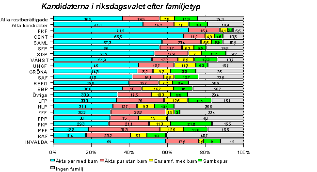 Drygt hälften (56 procent) av alla röstberättigade hör till familjer som består av åtminstone ett äkta par, 12 procent hör till sambofamiljer och en fjärdedel hör inte till familjer. Av kandidaterna är två tredjedelar gifta, 10 procent sambor och 19 procent är utanför familjebefolkningen. Ensamförsörjarna utgör 8 procent av båda grupperna. Kristliga förbundet avviker mest från den vanliga befolkningen: 88 procent är gifta och bara 3 procent sambor. Också bland kandidaterna för de stora partierna hör majoriteten till familjer med gifta par: för Centern är andelen 80 procent, för Samlingspartiet 78 procent och för SDP 71 procent. SDP har mest samboende kandidater, dvs. 13 procent. Mer än hälften av de stora partiernas kandidater har utöver äkta make också barn. Livet bland barnfamiljer är med andra ord bekantare för dem än för väljarna i medeltal. Mest välbekant är det för kandidaterna för kristliga förbundet och Centern.
