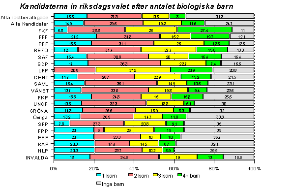 Då majoriteten av kandidaterna lever i familjer som består av gifta par med barn faller det sig naturligt att det finns få kandidater som inte alls haft barn. Av de röstberättigade är 34 procent personer som inte har haft eller inte ännu har barn; bland kandidaterna är motsvarande andel 25 procent.