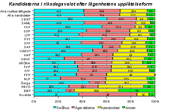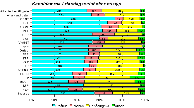 Centerns, Samlingspartiets, kristliga förbundets och SDP:s samt Vänsterförbundets kandidater har bostäder i småhus. Bara 15-25 procent av kandidaterna för dessa partier bor i flervåningshus, medan 34 procent av hela väljarkåren bor i flervåningshus.