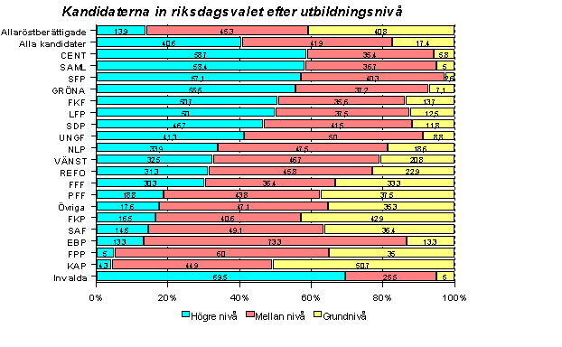 Till riksdagen väljs högt utbildade människor. Kandidaterna för nästan alla partier har en högre utbildningsnivå än befolkningen i medeltal. Av hela befolkningen har 41 procent utbildning på grundnivå, men detsamma gäller för bara 17 procent av kandidaterna, och för en ännu mindre del av de stora partiernas kandidater, dvs. för 6 procent av Centerns kandidater, för 5 procent av Samlingspartiets kandidater, för 3 procent av SFP:s kandidater, för 7 procent av Gröna Förbundets kandidater och för 12 procent av SDP:s kandidater.