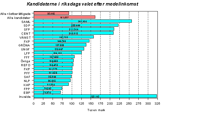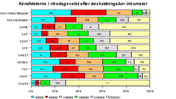 Av de stora partiernas kandidater har majoriteten inkomster på mer än 200 000 mark: 57 procent av Samlingspartiets kandidater, 52 procent av SDP:s kandidater, 48 procent av Centerns kandidater och 45 procent av SFP:s kandidater har inkomster som överskrider 200 000 mark. Av samtliga röstberättigade har bara 6 procent inkomster på mer än 200 000 mark. Centern och SFP avviker från Samlingspartiet och SDP så till vida att deras kandidatlistor också omfattar personer med inkomster på mindre än 50 000 mark. Detta gäller också Gröna Förbundet och ungfinnarna, som t.ex. har fler studerande på sina kandidatlistor än de övriga partierna. Var tredje väljare är tvungen att klara sig på inkomster som är lägre än 50 000 mark, inom Samlingspartiet gäller detta var tionde kandidat.