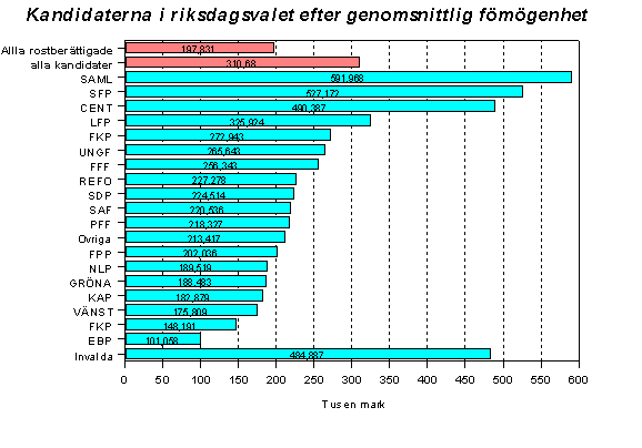 De röstberättigade har enligt beskattningsuppgifterna i medeltal förmögenhet till ett värde om 200 000 mark, medan kandidaterna har förmögenhet som är värd 310 000 mark. Samlingspartiets kandidater har mest förmögenhet, dvs. 592 000 mark, SFP:s kandidater 527 000 mark och Centerns kandidater 490 000 mark. Av de stora partierna befinner sig SDP på en betydligt lägre förmögenhetsnivå, dvs. 225 000 mark.