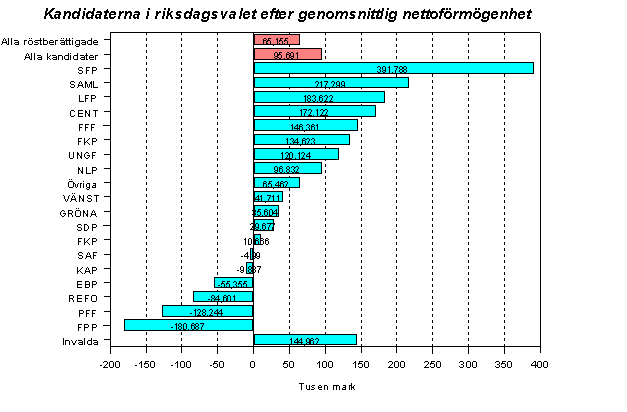 Genom att dra av skulderna från den beskattningsbara förmögenheten får man en bild av kandidaternas nettoförmögenhet. De röstberättigade har en nettoförmögenhet på 65 000 mark, kandidaterna i medeltal 96 000 mark. Skillnaderna mellan de olika partierna är väldigt stora: SFP:s kandidater har i medeltal 392 000 mark i tillgångar, samlingspartiets 217 000 mark, Centerns 172 000 mark och SDP:s 30 000 mark. Kandidaterna för de små partierna har mera skulder än tillgångar, vilket innebär att nettoförmögenheten är negativ.