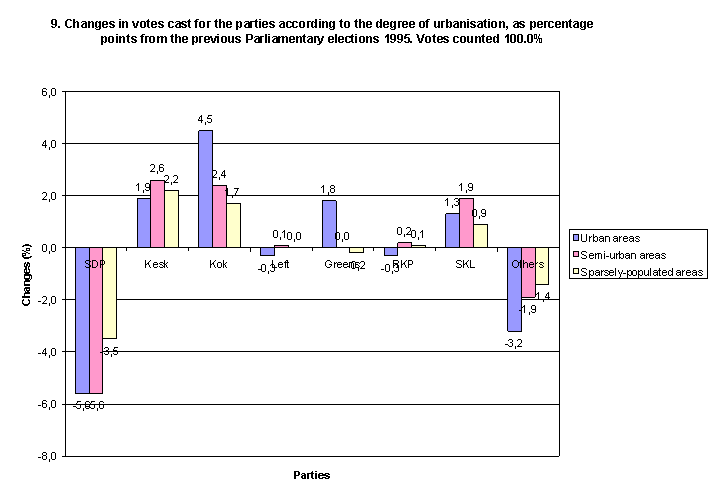 Changes in votes cast for the parties according to the degree of urbanisation