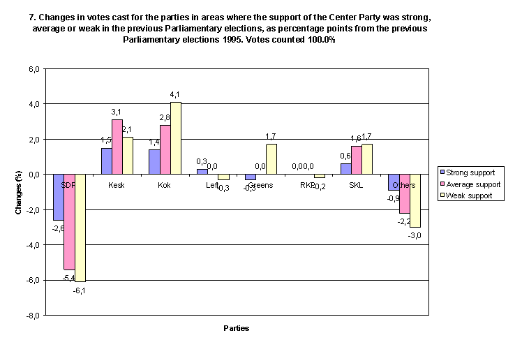 Changes in votes cast for the parties in areas where the support of the Center Party was strong, avearage or weak in the previous Parliamentary elections