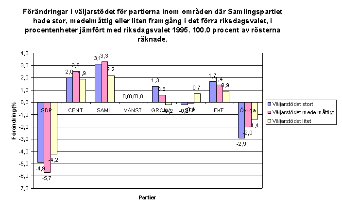 Förändringar i väljarstödet för partierna inom områden där Samlingspartiet hade stor, medelmåttig eller liten framgång i det förra riksdagsvalet 1995