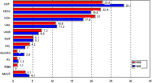 Puolueiden kannatus eduskuntavaaleissa 1999 ja 1995